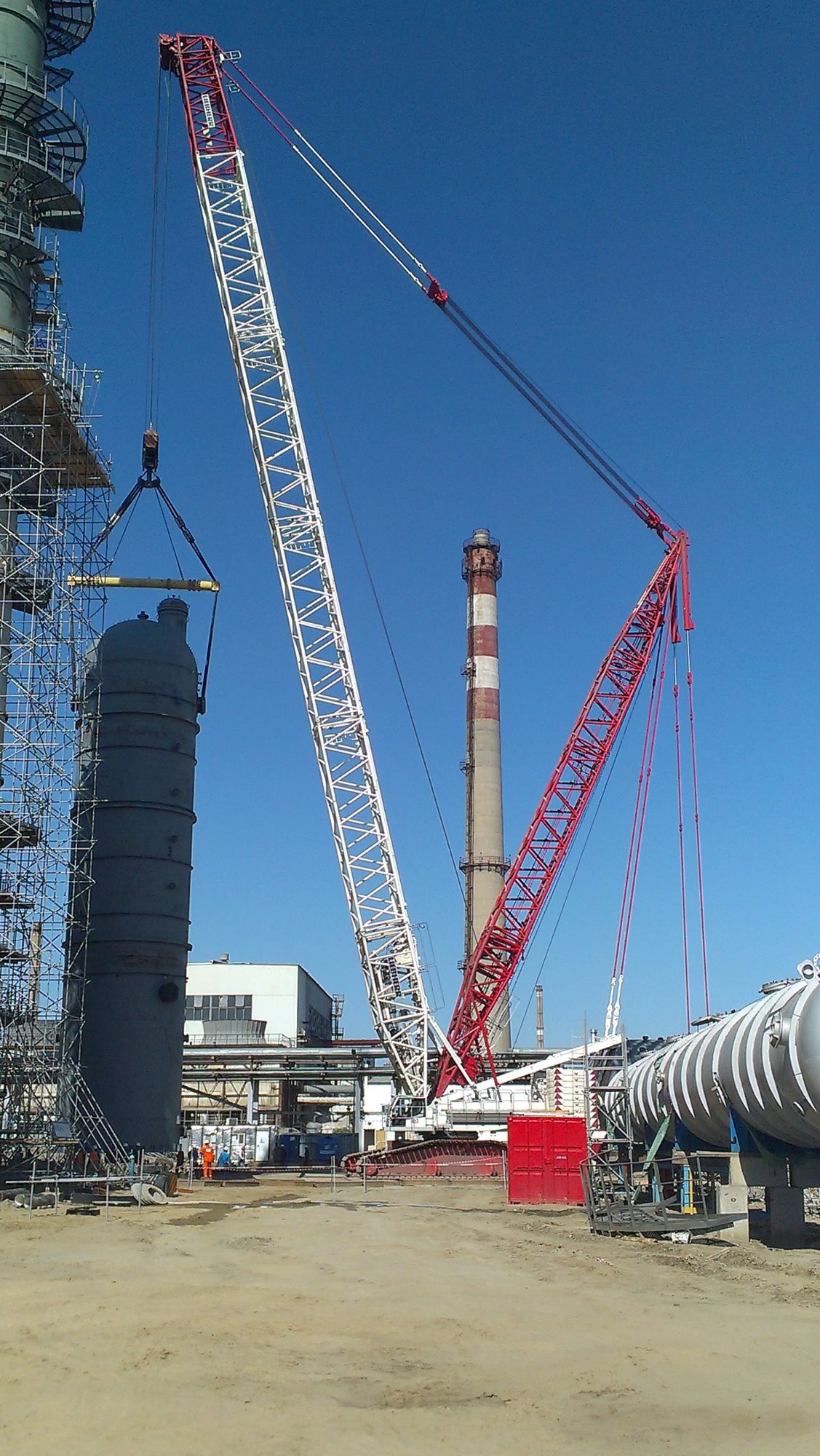 В Казахстане, в г. Атырау наш гусеничный кран Liebherr LR1600/2 участвовал в реконструкции Атырауского нефтеперерабатывающего завода. Нами было установленно оборудование общим весом больше 2000т. Самые значительные подъемы: монтаж 2-х реакторов по 350 тонн и монтаж реактора высотой 120м.