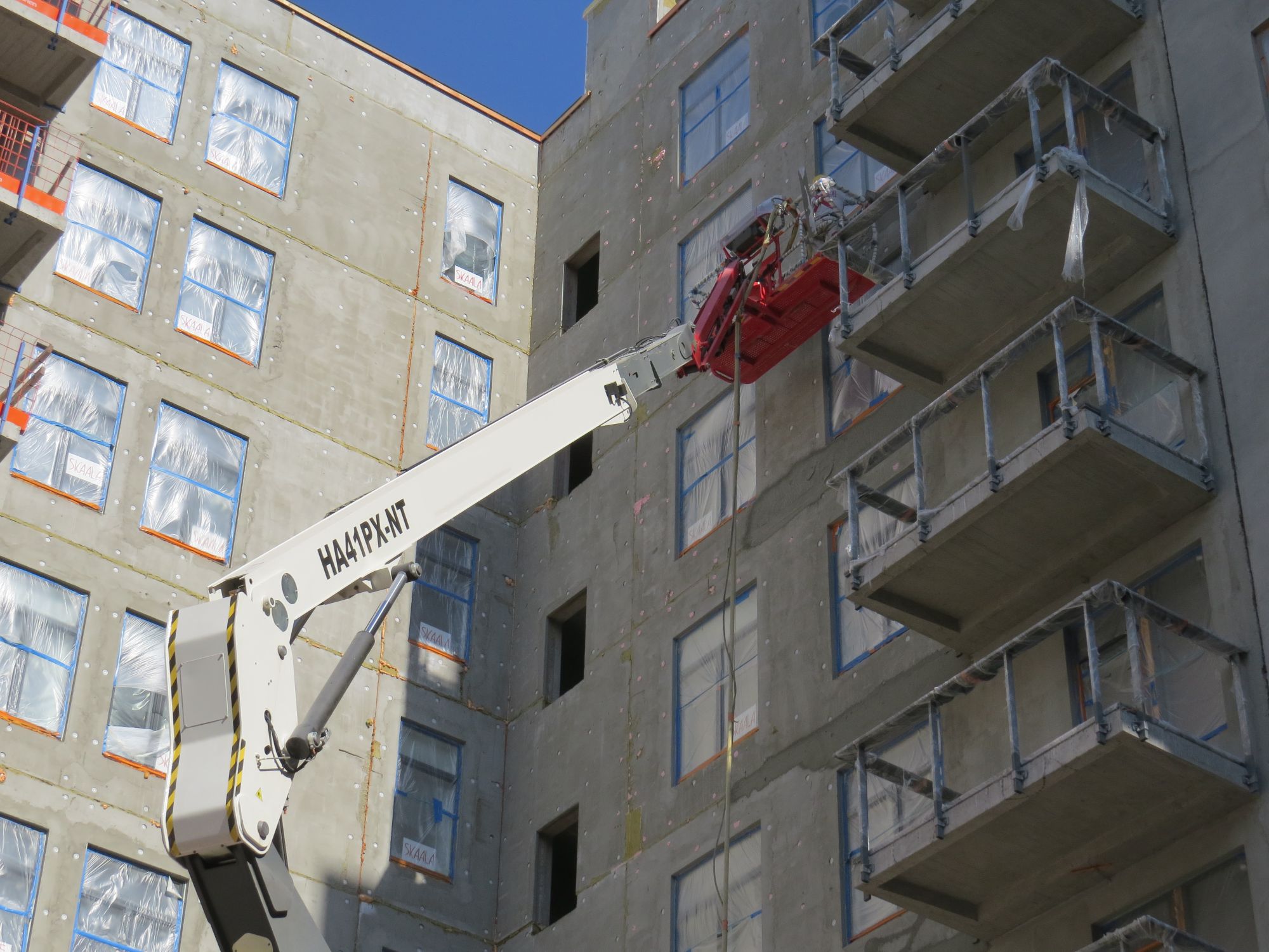Наглядный пример работы дизельных стреловых подъемников с рабочей высотой 32 и 41 метр. Строительство многоэтажного жилого комплекса.