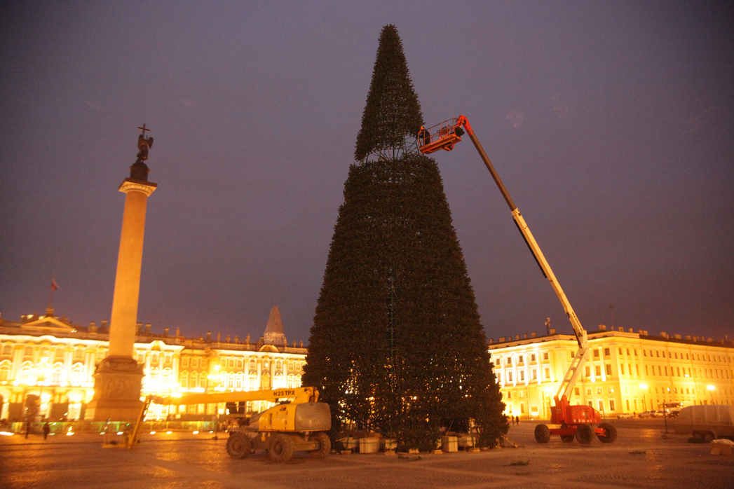 В этот раз в монтаже участвовали коленчатые дизельные подъемники Haolotte и Dino Lift. Работы проводились только в ночное время суток, т.к. днем Дворцовая площадь должна быть свободна для туристов и гостей города.