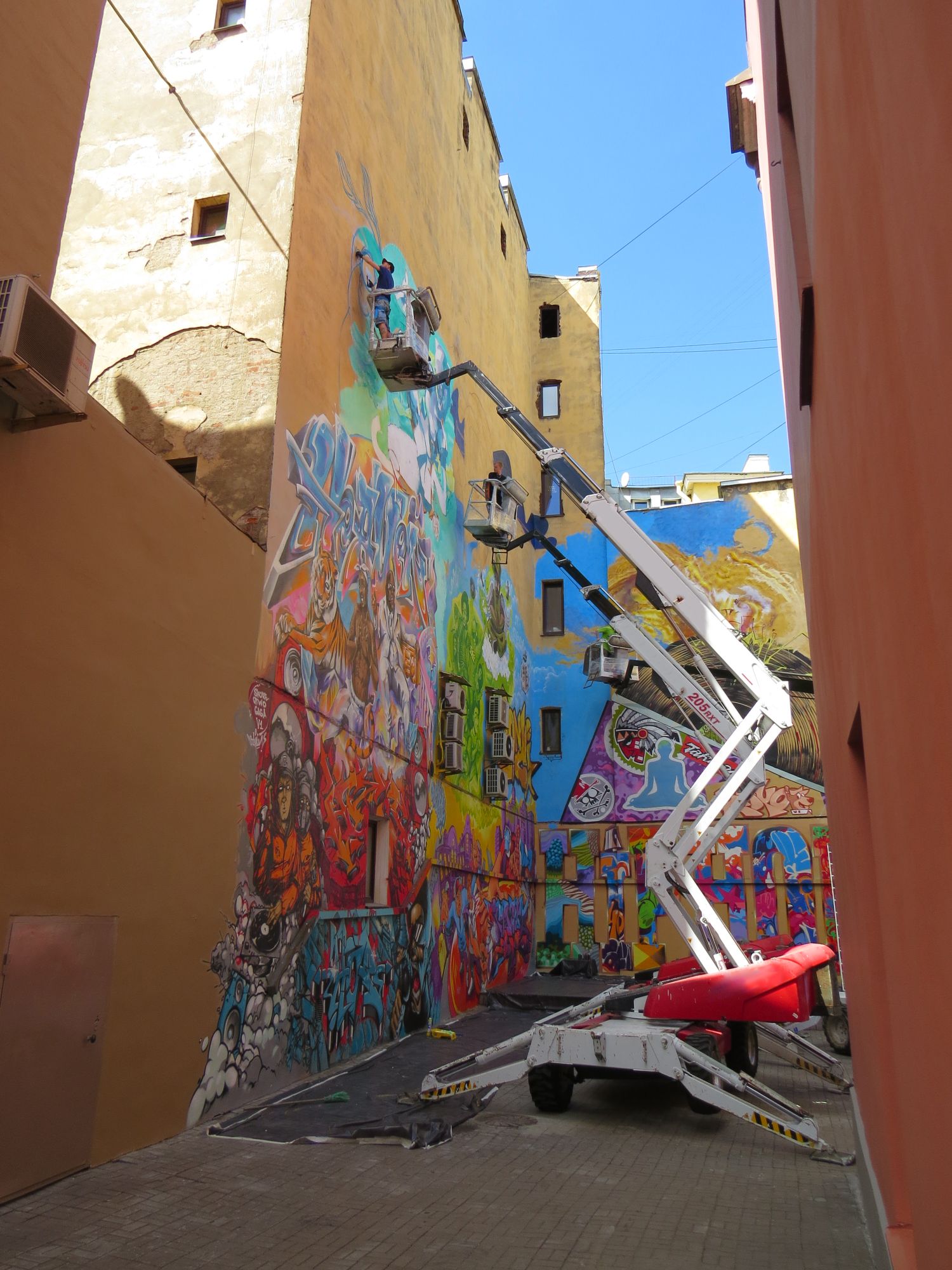 Стоит отметить, что внутренние дворы в исторической части Санкт-Петербурга имеют очень малый размер, но этот фактор не помешал разместить подъемники с высотой подъема платформы 22 метра и работать на них одновременно.